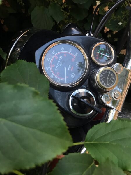Kuvassa Bulletin mittaristo. Virta-avain on mustaksi katkaisijaksi naamioituna. Virtamittari löytyy kellon vierestä. Sen viisarin heiluessa vihreällä akkua ladataan enemmän kuin sitä kulutetaan, punaisella päinvastoin.